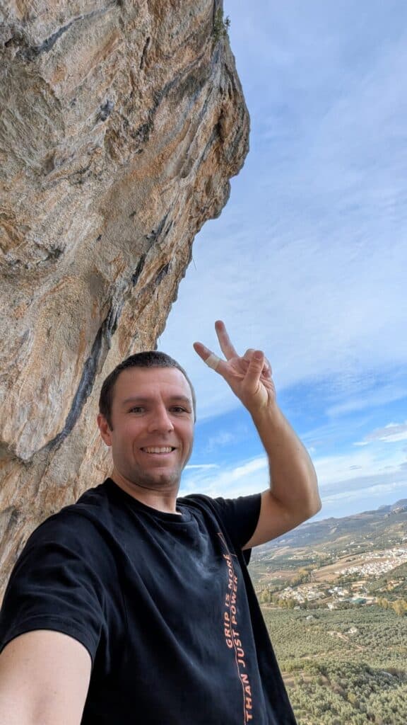 Beim Ablassen vermischen sich Tränen der Freude und Erleichterung. Ich binde mich aus. Mache mich mit weichen Knien auf zu meinem Sicherungspartner. Mein Trainer, Freund und Papa in Personalunion. Wir freuen uns und liegen uns in den Armen! Es ist geschafft, „La Planta de Shiva“ 9b, 8te Begehung durch Martin Tekles