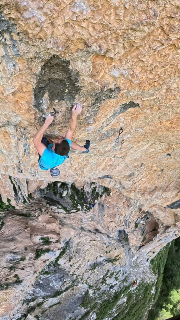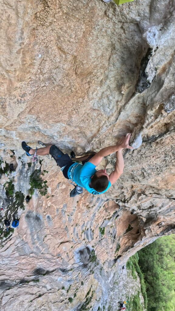Anschließend eine Stunde und 15 Minuten Pause bis zum ersten Durchstiegsversuch an diesem Tag. 40 Minuten vor dem Versuch klettere ich nochmal 20 Züge in einer 8b. Es mag nach Zwängen aussehen, alles ist durchgetaktet, aber so weiß ich genau, dass ich zu Punkt X die perfekte Leistung bringen kann.